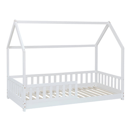 Pat pentru copii Bambie cu balustrada tip Montessori din lemn de pin alba 70x140cm