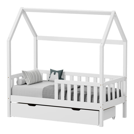 Pat pentru copii Bendina de tip Montessori cu sertar din lemn de pin alba 70x140cm