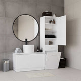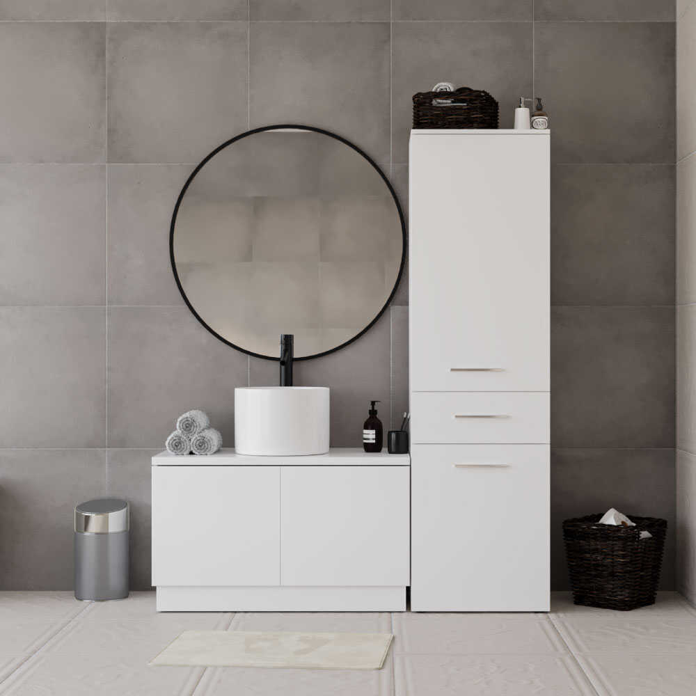 Beneficiezi de un coș de rufe integrat, discret și ușor accesibil, ideal pentru a păstra baia mereu curată și organizată. Cele trei rafturi reglabile și sertarul adânc îți permit să organizezi eficient produsele de igienă, prosoapele sau accesoriile.