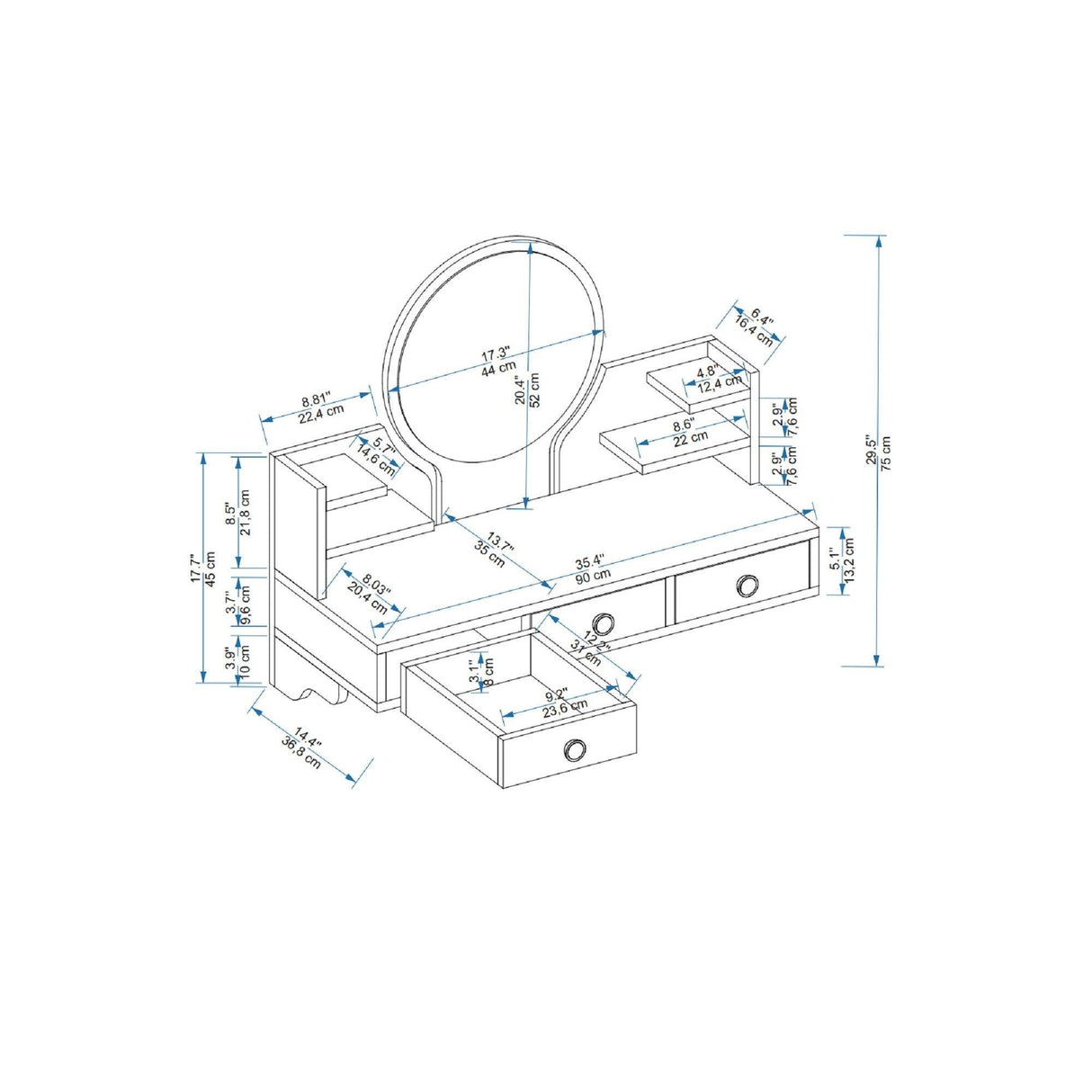 Masa de machiaj Polina cu 3 Sertare si Oglinda, 90 x 75 x 37 cm