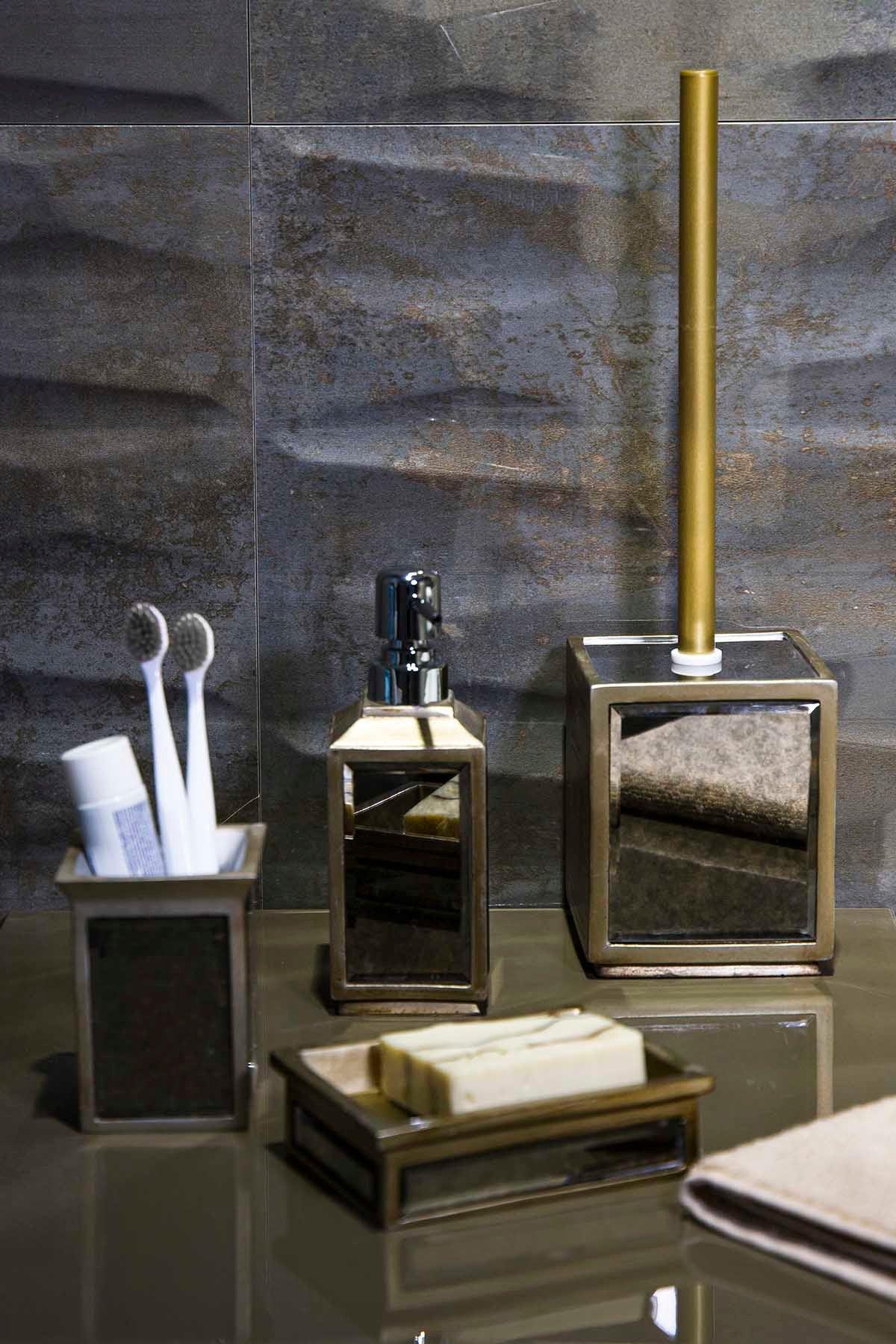 Set de Baie Lux Mirror, Bronz, Dozator de sapun, Perie, Suport de periuta de dinti, Sapuniera