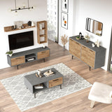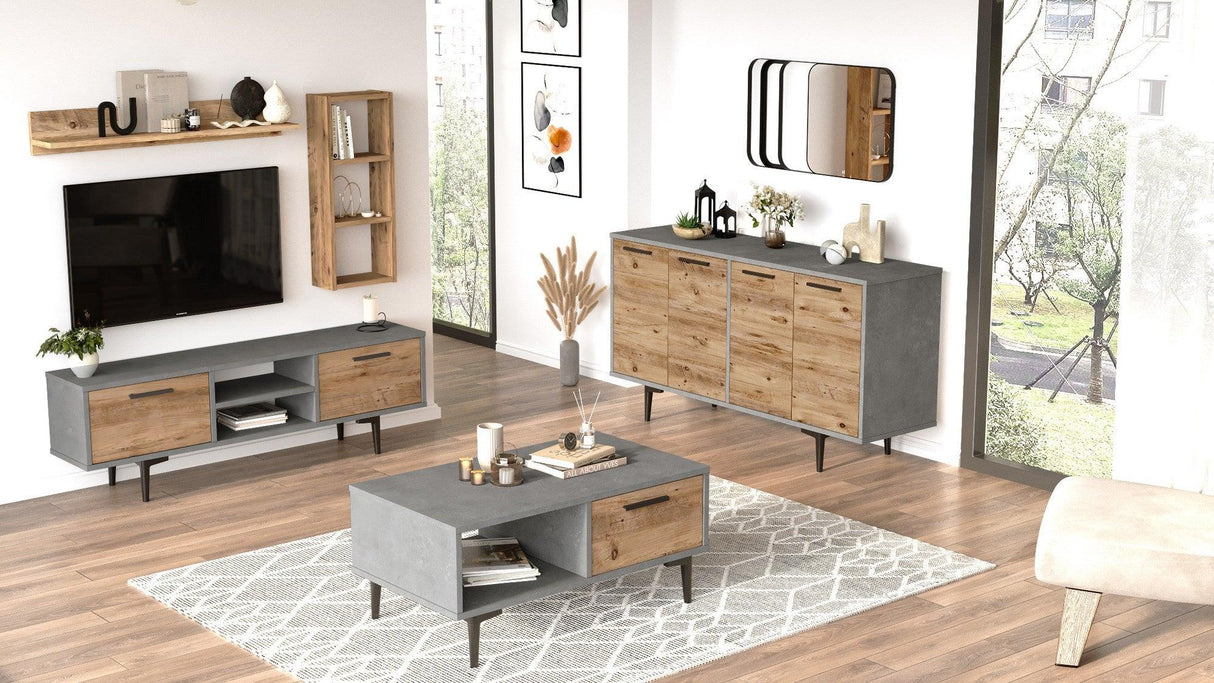 Set Mobila Sufragerie Roas, Gri - Stejar, 3 piese, Comoda tv - Consola - Masuta de Cafea