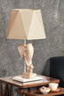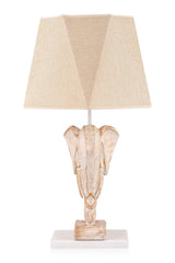 Abajurul textil cu aspect natural, dar și finisajul alb antichizat al sculpturii, adaugă un aer exotic oricărui spațiu.