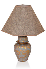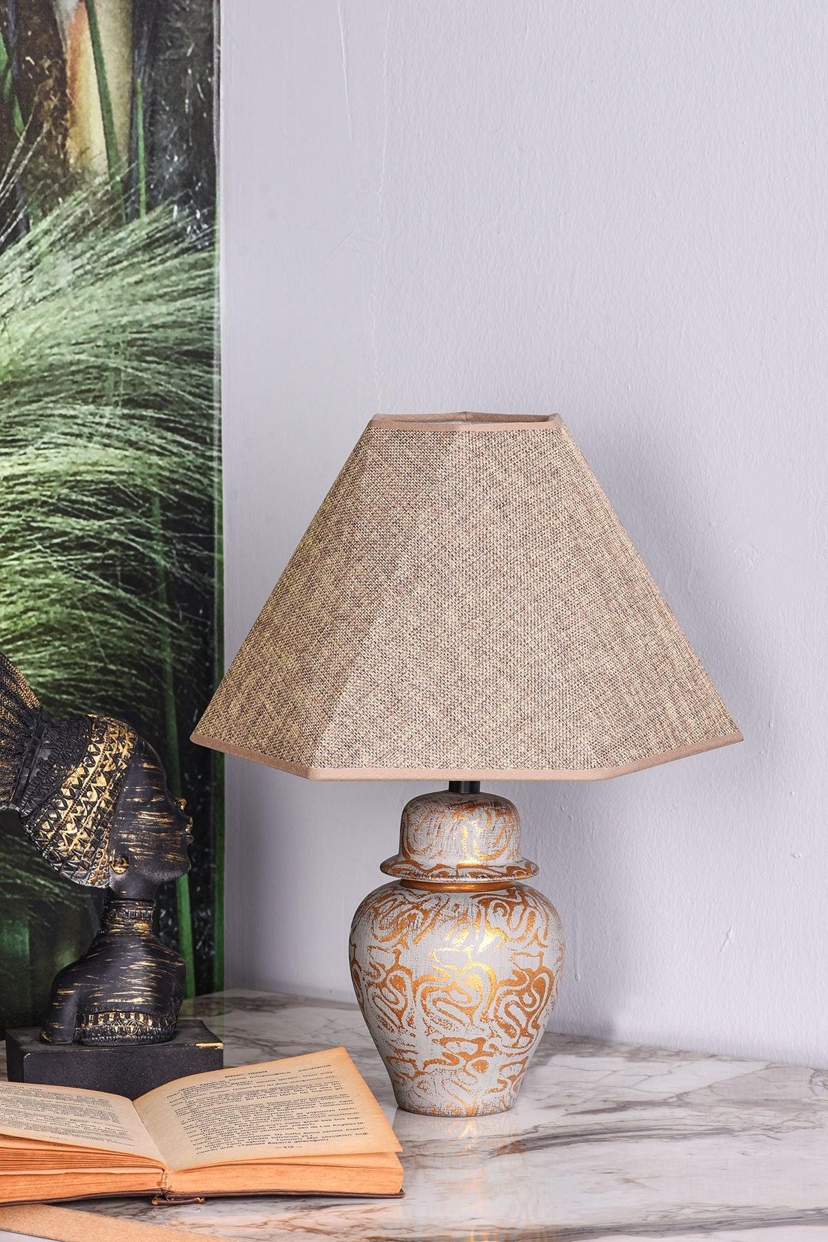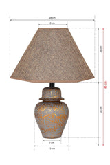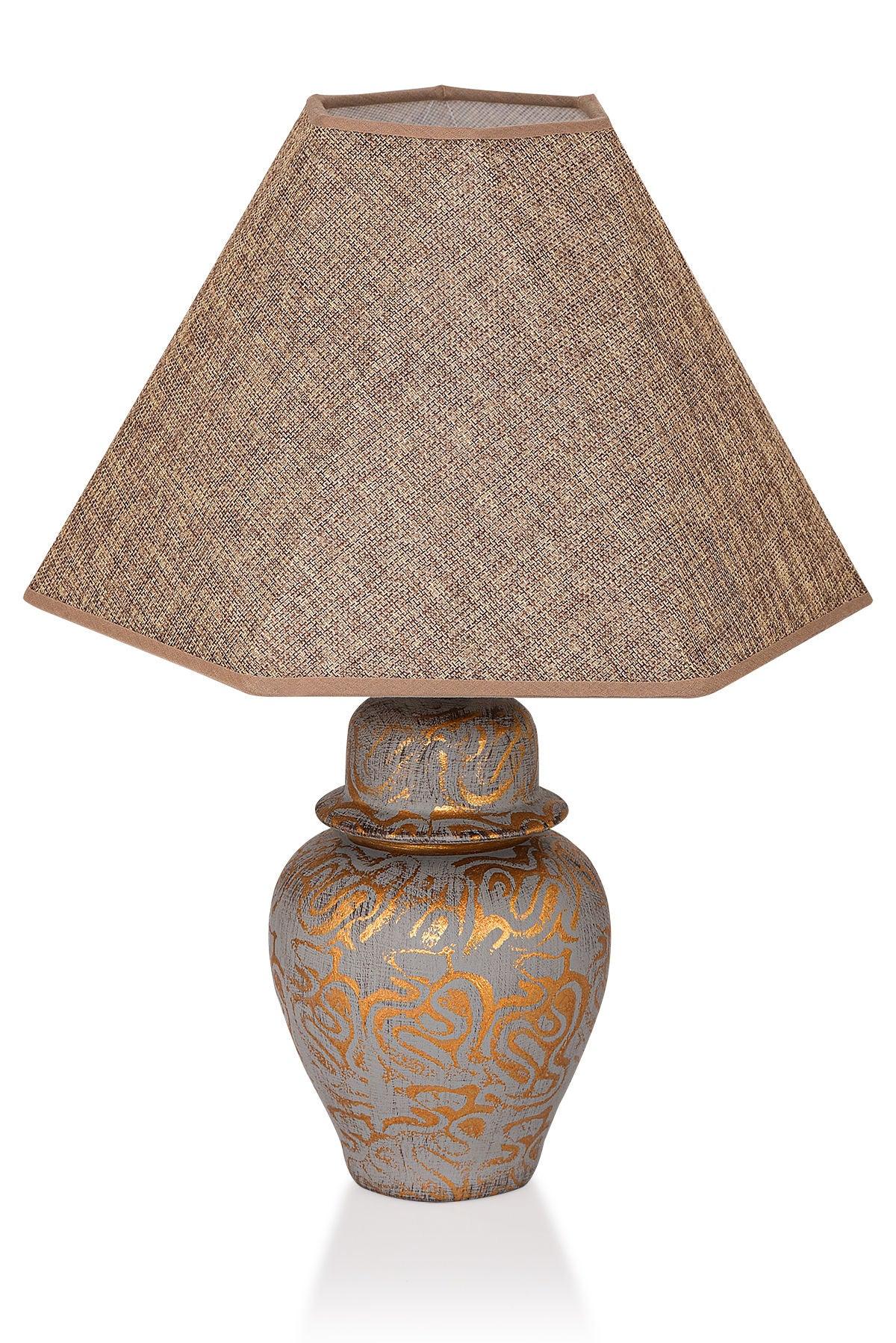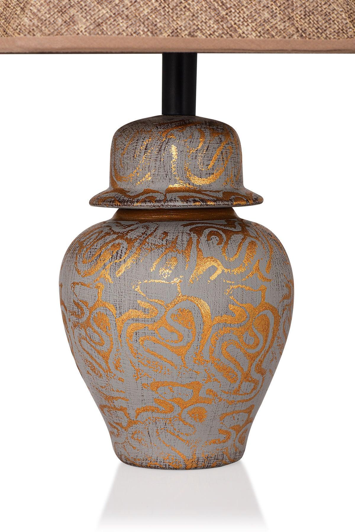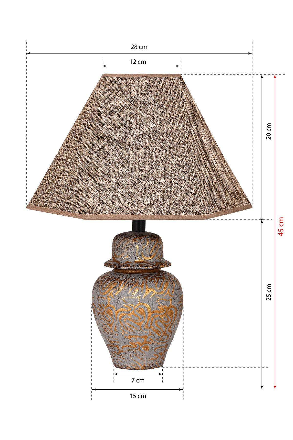 Lampa este prevăzută cu un capac din țesătură care adaugă o notă de eleganță și moliciune aspectului său general. Diametrul de 28 cm și înălțimea de 20 cm ale capacului oferă echilibrul perfect între funcționalitate și estetică. Combinația dintre culorile gri și auriu creează un contrast vizual uimitor, făcând din această lampă o adevărată piesă statement.